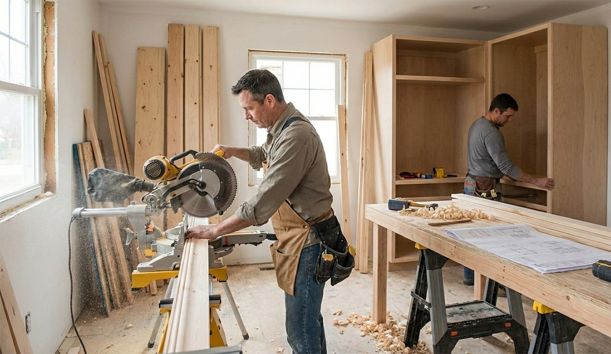 Custom carpentry services including trim work, cabinetry, and built-in furniture.