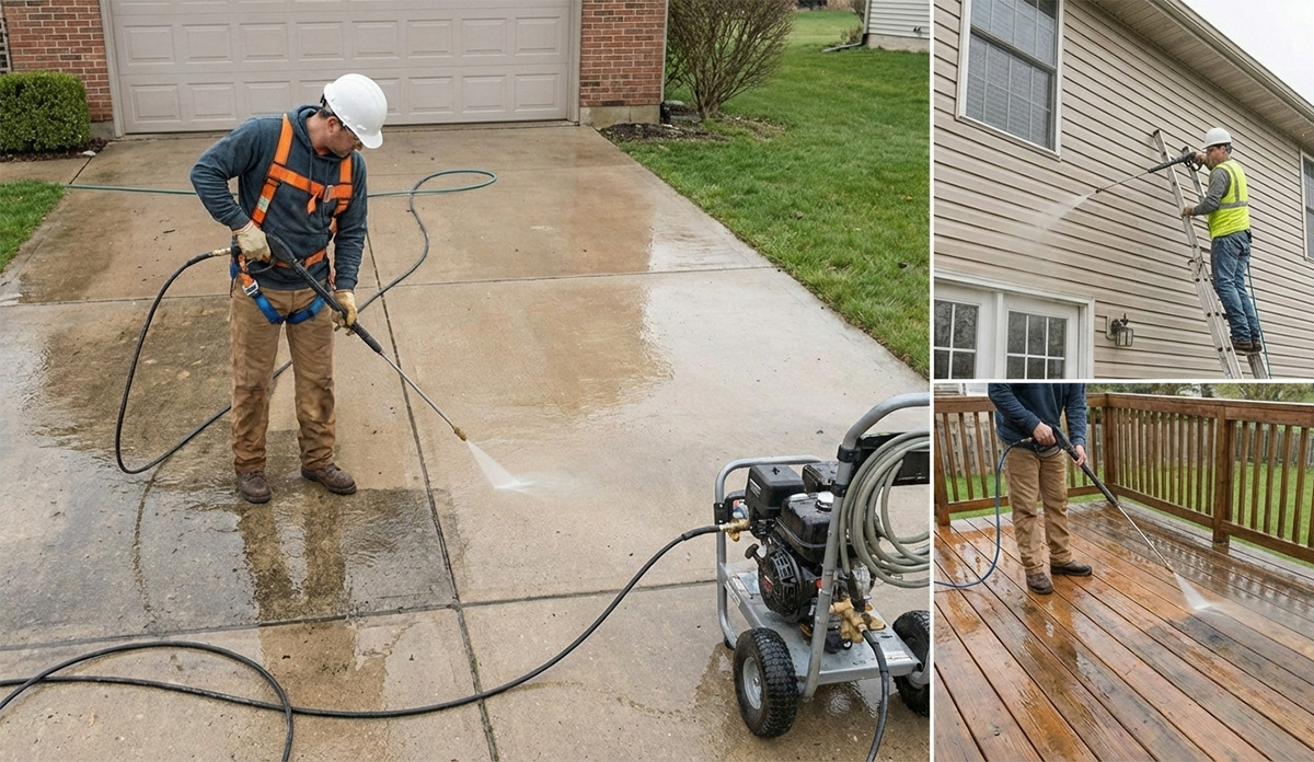 Exterior cleaning services including power washing for decks, siding, driveways, and patios.